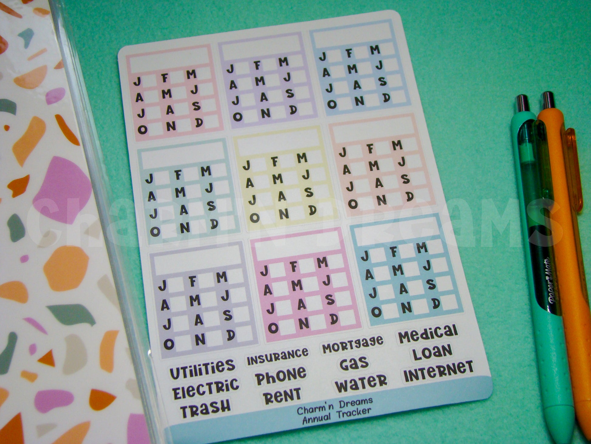 Keep track of your monthly recurring payments and tasks with this fun Annual Tracker Functional Sticker Sheet! Each colorful sticker is designed to help you check off important reminders throughout the year, making organization simple and enjoyable. Perfect for planners, journals, or calendars, these playful stickers turn tedious tracking into a colorful game.