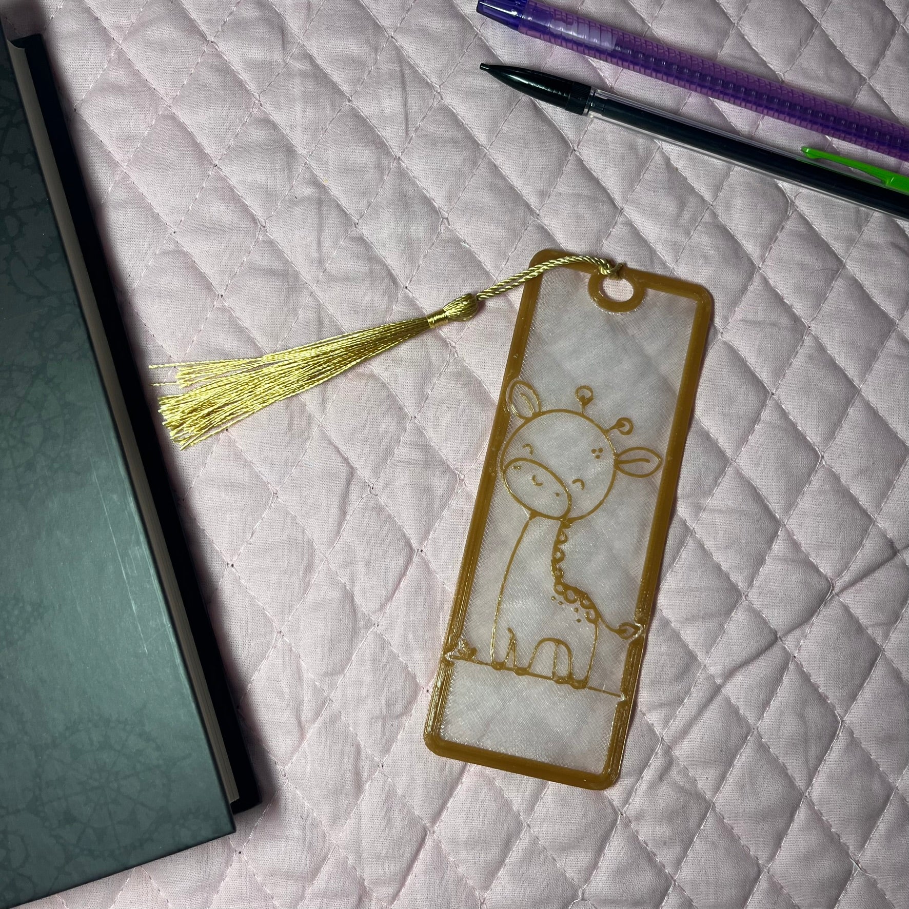 A Baby Giraffe Bookmark 3d printed (PETG) Bookmark! The 3d printed file is created and printed in house for a fun and meaningful product.