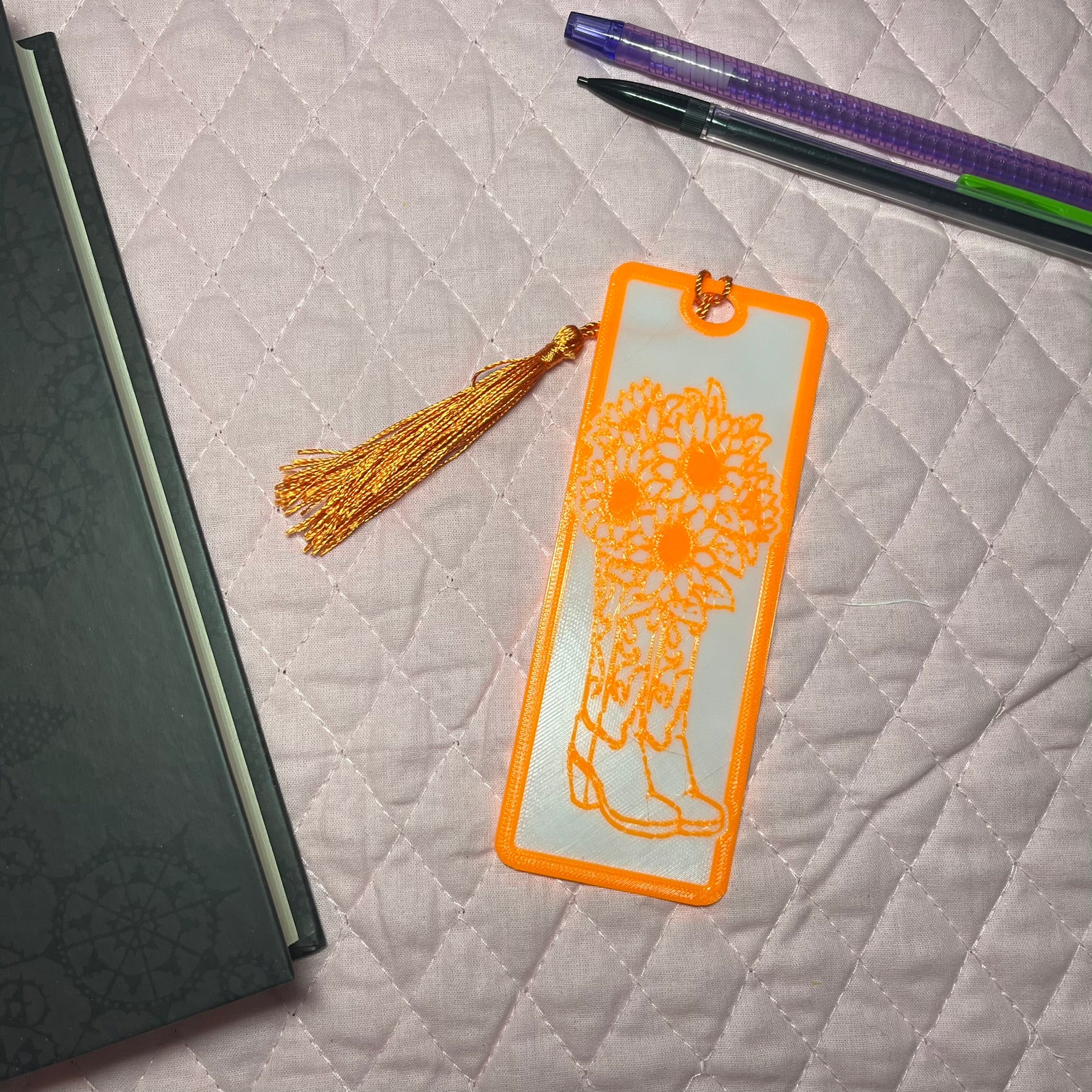 A neon orange sherbert Boots and Flowers 3d printed (PETG) Bookmark! The 3d printed file is created and printed in house for a fun and meaningful product.