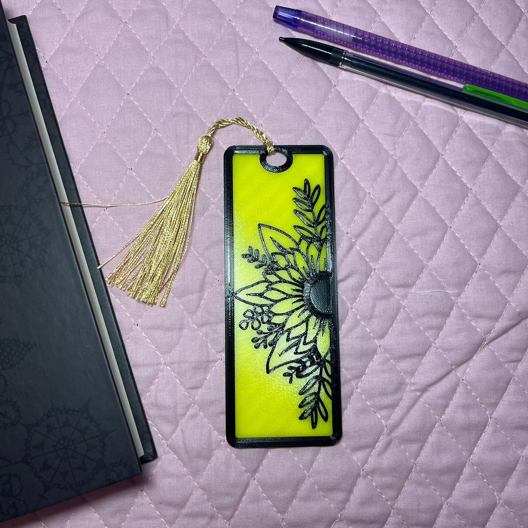 A Bright Sunflower 3d printed (PETG) Bookmark! The 3d printed file is created and printed in house for a fun and meaningful product.