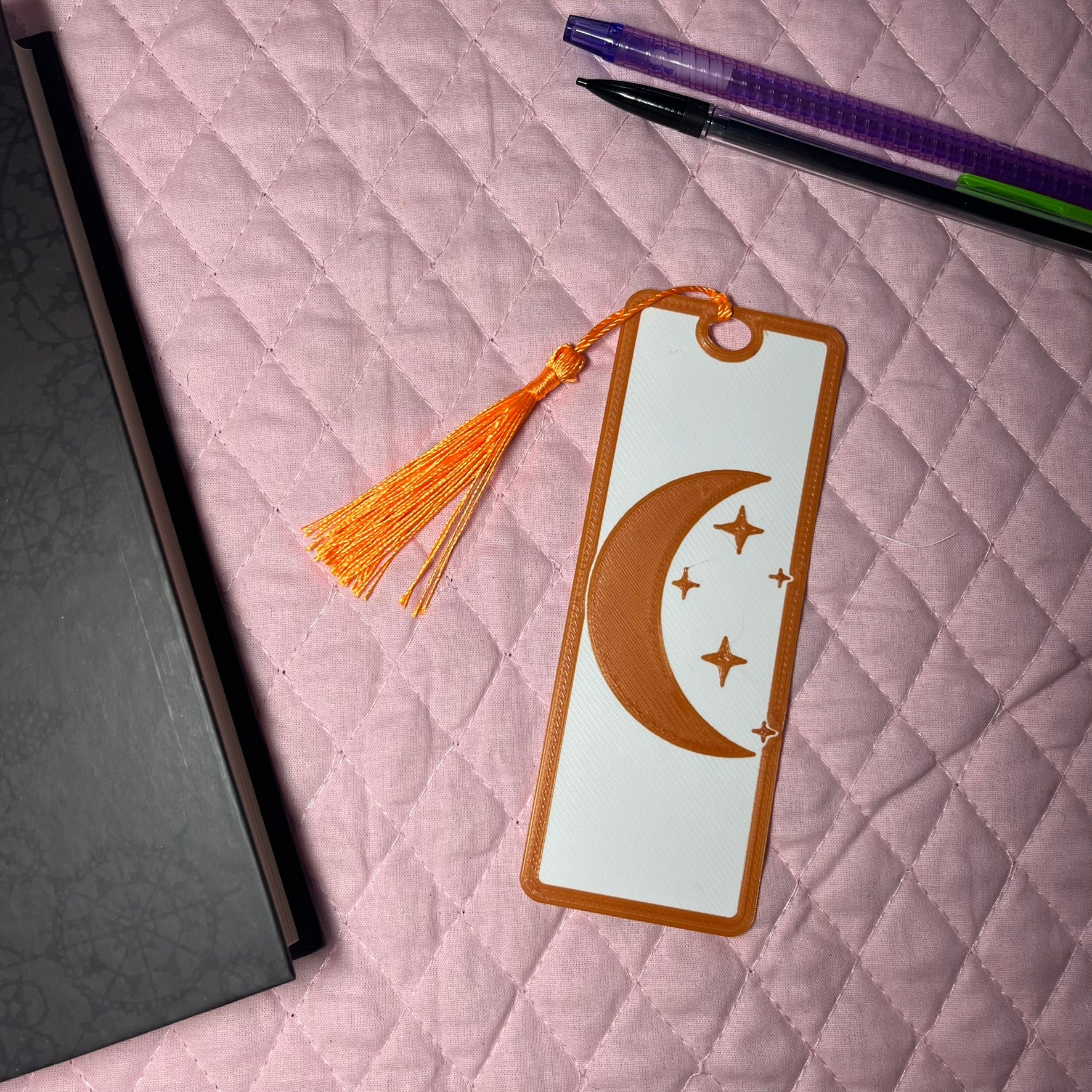 A Cresent Moon 3d printed (PETG) Bookmark! The 3d printed file is created and printed in house for a fun and meaningful product.