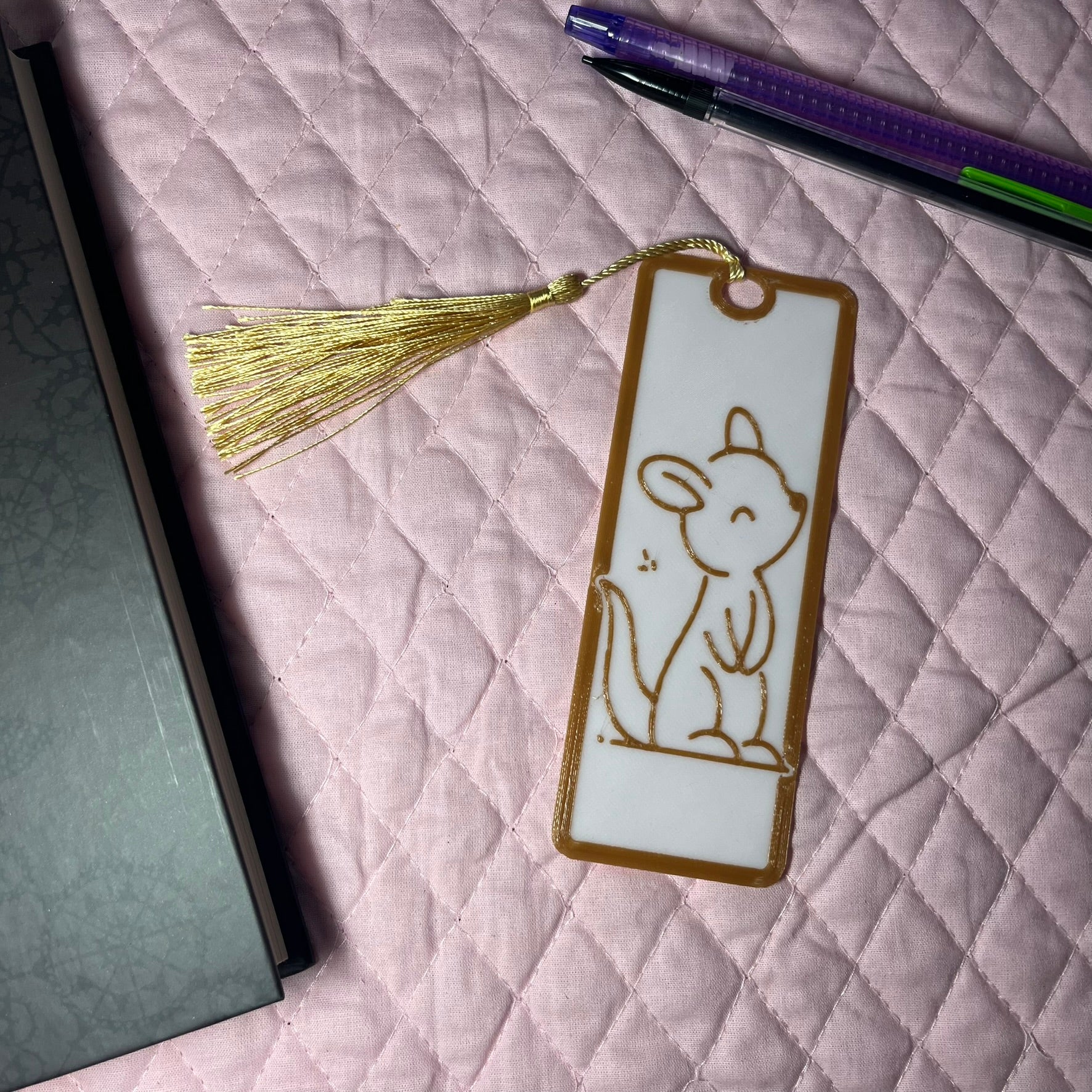 A cute roo Bookmark 3d printed (PETG) Bookmark! The 3d printed file is created and printed in house for a fun and meaningful product.