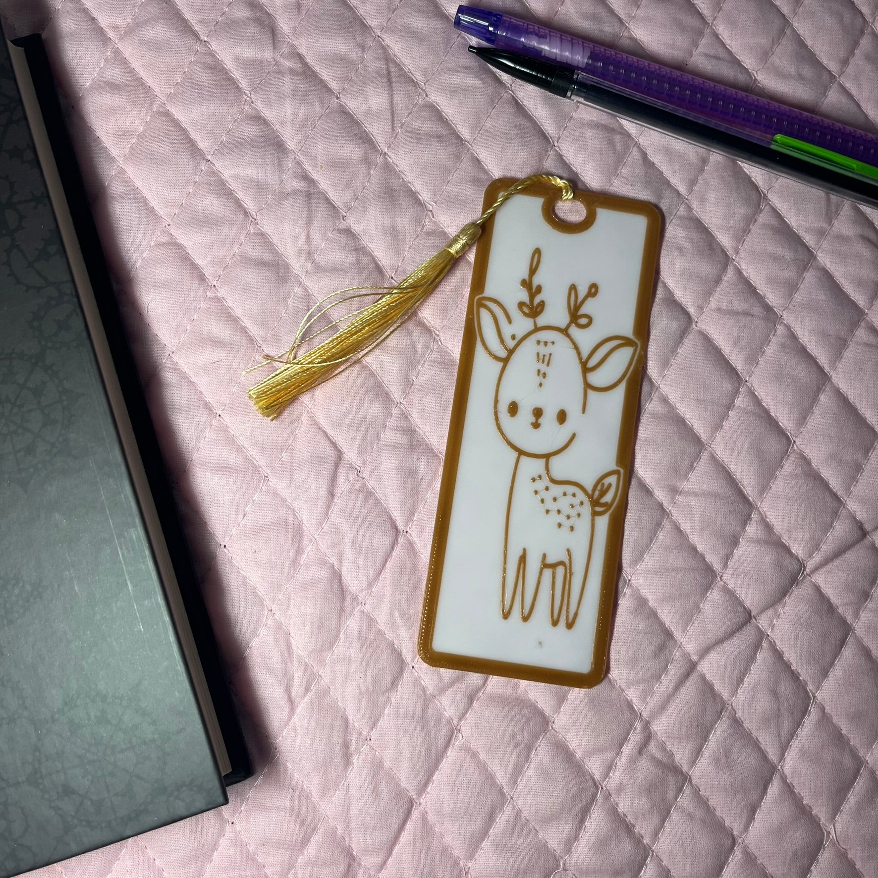 A Deary Deer Bookmark 3d printed (PETG) Bookmark! The 3d printed file is created and printed in house for a fun and meaningful product.