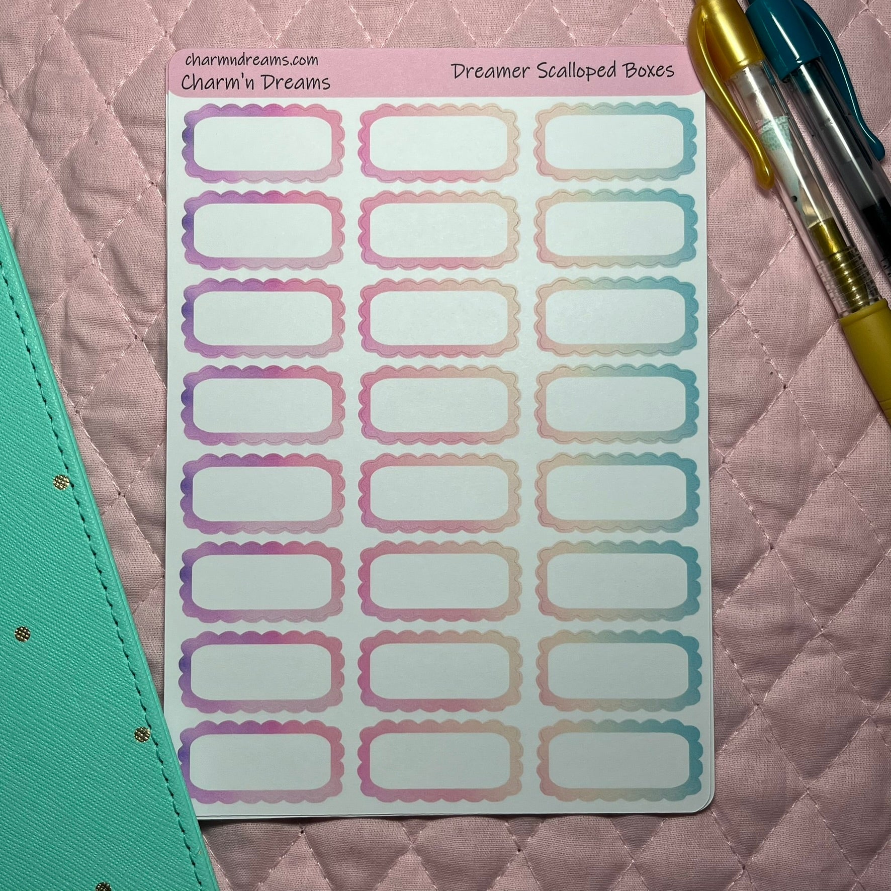 Decorate your planner with ease using the Dreamer Scalloped Planner Sticker Boxes. Made with permanent matte sticker paper, each sheet contains 24 labels measuring 0.6 inches by 1.5 inches. Add a touch of charm to your monthly spread or weekly layout.