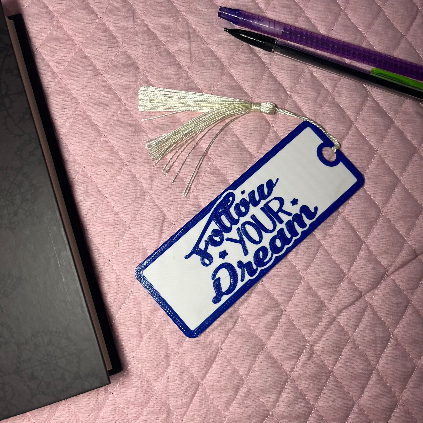 A Follow Your Dream 3d printed (PETG) Bookmark! The 3d printed file is created and printed in house for a fun and meaningful product.