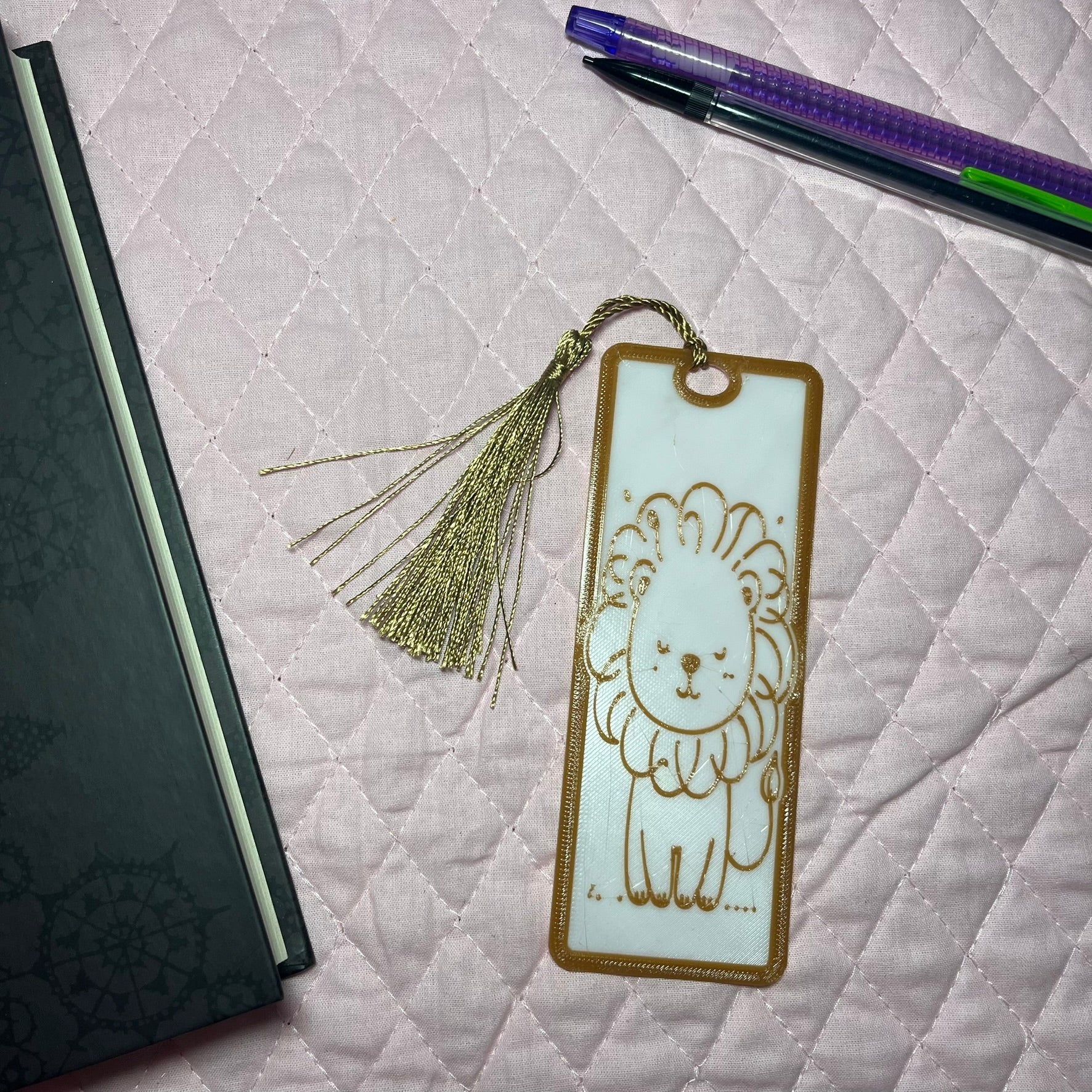 A Gentle Lion Bookmark 3d printed (PETG) Bookmark! The 3d printed file is created and printed in house for a fun and meaningful product.