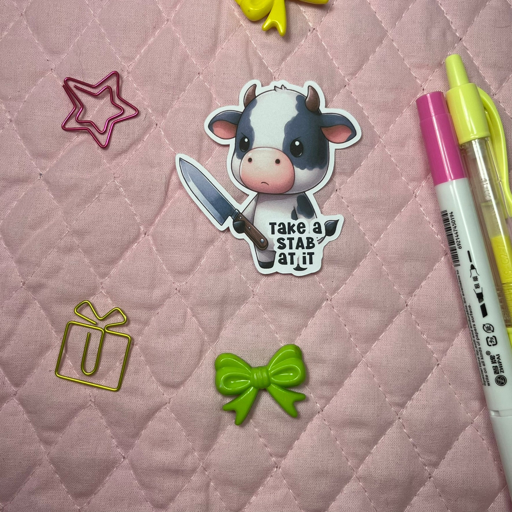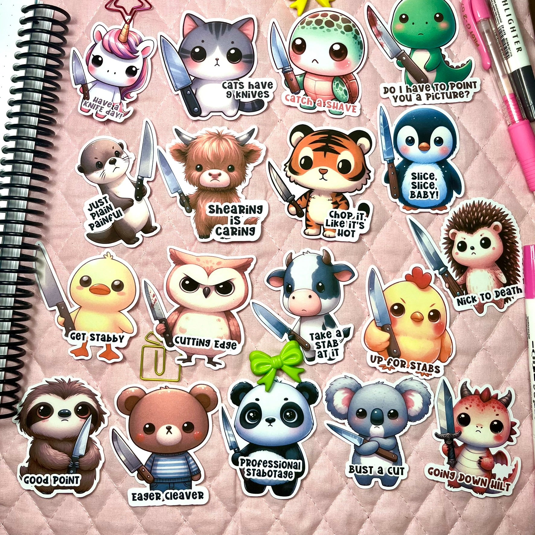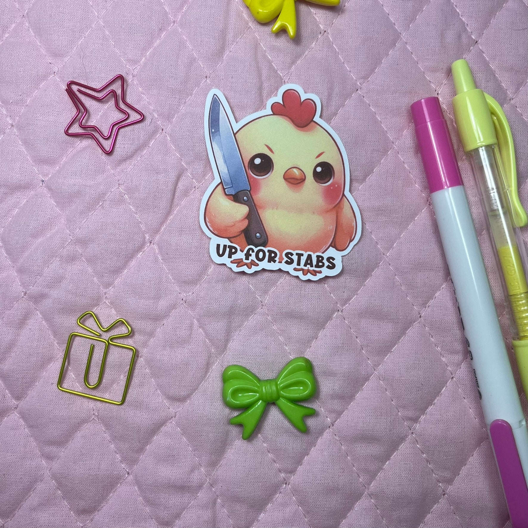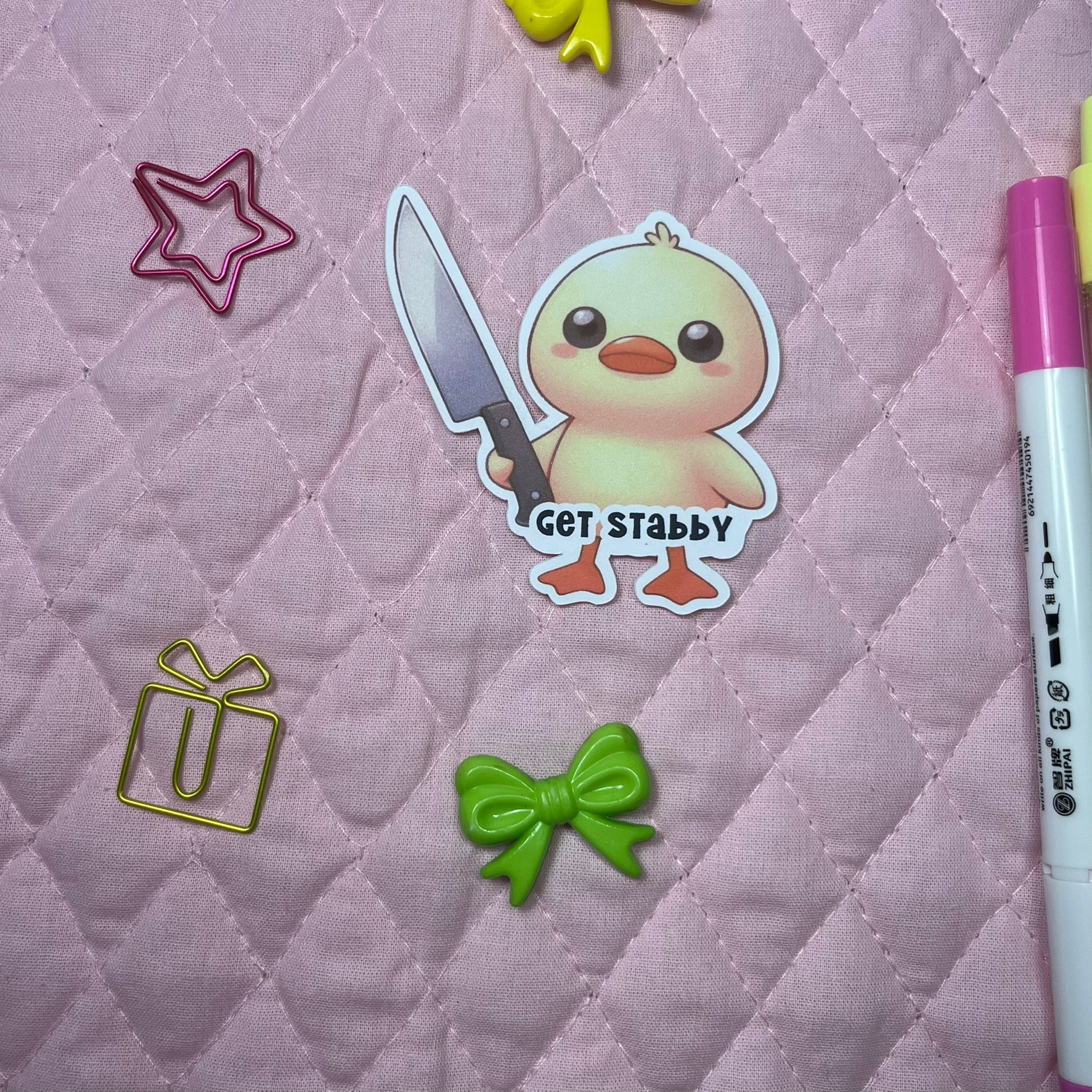 Add a touch of sass to your belongings with our Get Stabby weatherproof stickers. At 2.5 inches tall, these stickers are perfect for showing off your love for sarcastic humor. These weatherproof stickers are made with a glossy white sticker paper and for added protection a thick laminate overlay is placed onto the image.