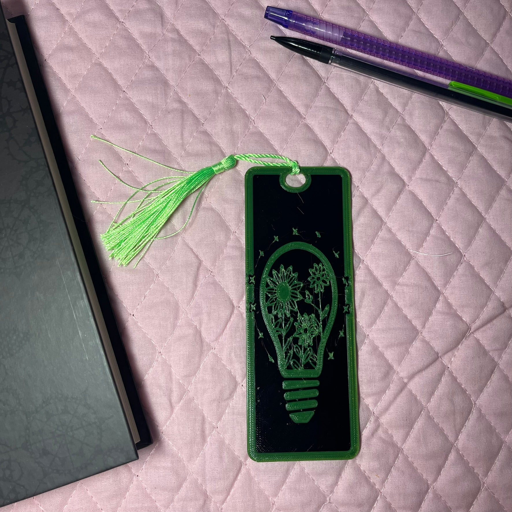 A Lightbulb of Flowers 3d printed (PETG) Bookmark! The 3d printed file is created and printed in house for a fun and meaningful product.