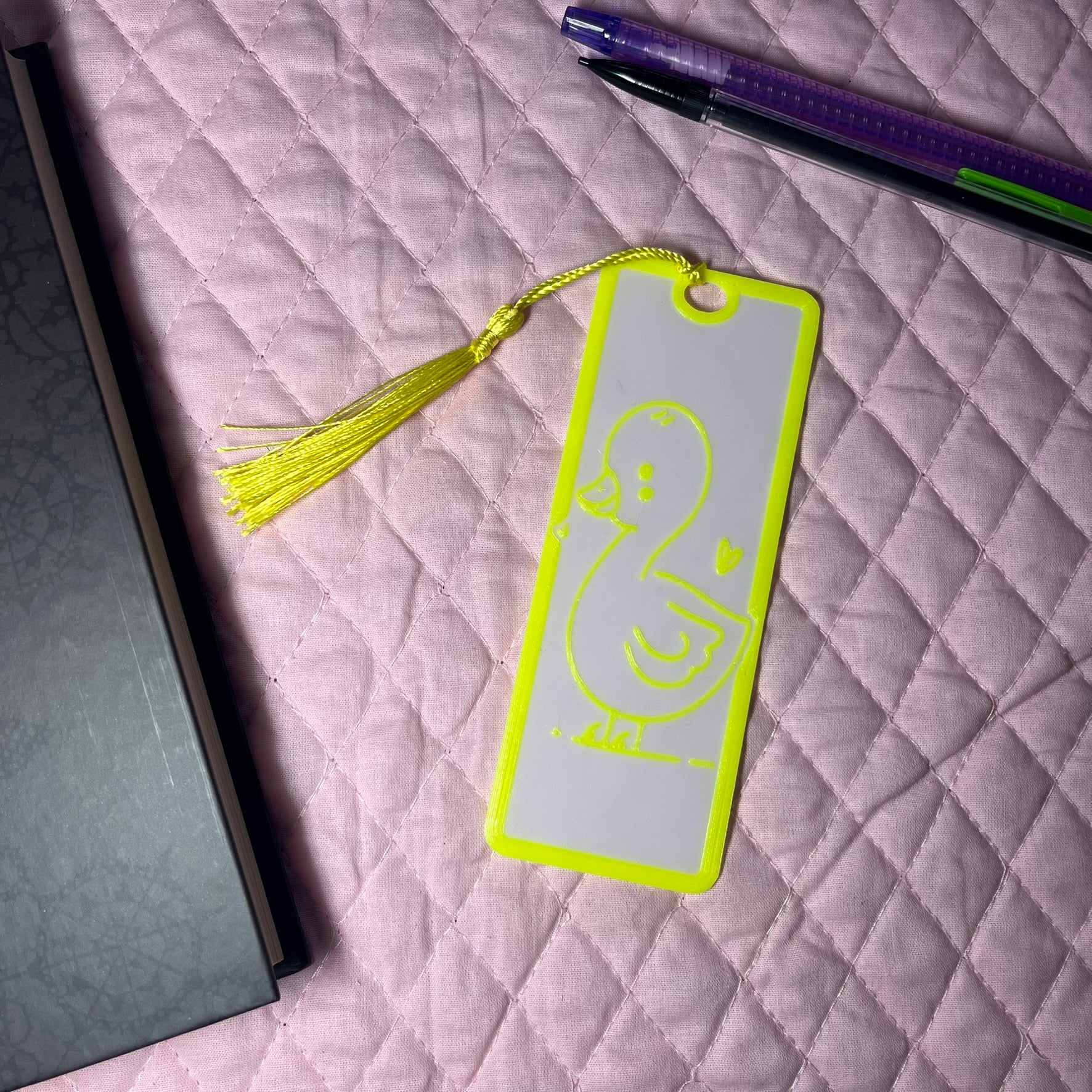 A neon duckling Bookmark 3d printed (PETG) Bookmark! The 3d printed file is created and printed in house for a fun and meaningful product.