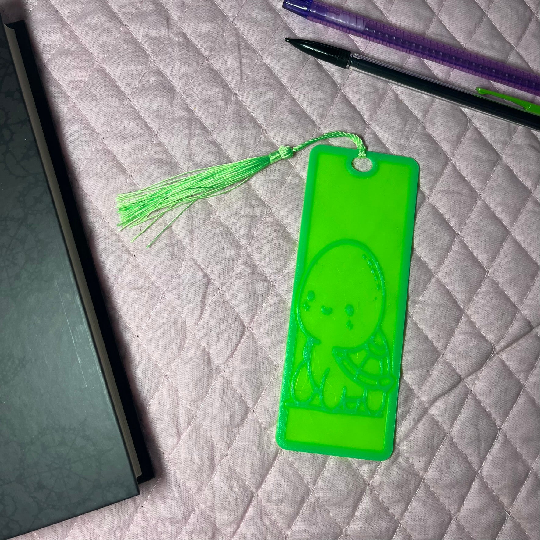 A Neon turtle Bookmark 3d printed (PETG) Bookmark! The 3d printed file is created and printed in house for a fun and meaningful product.