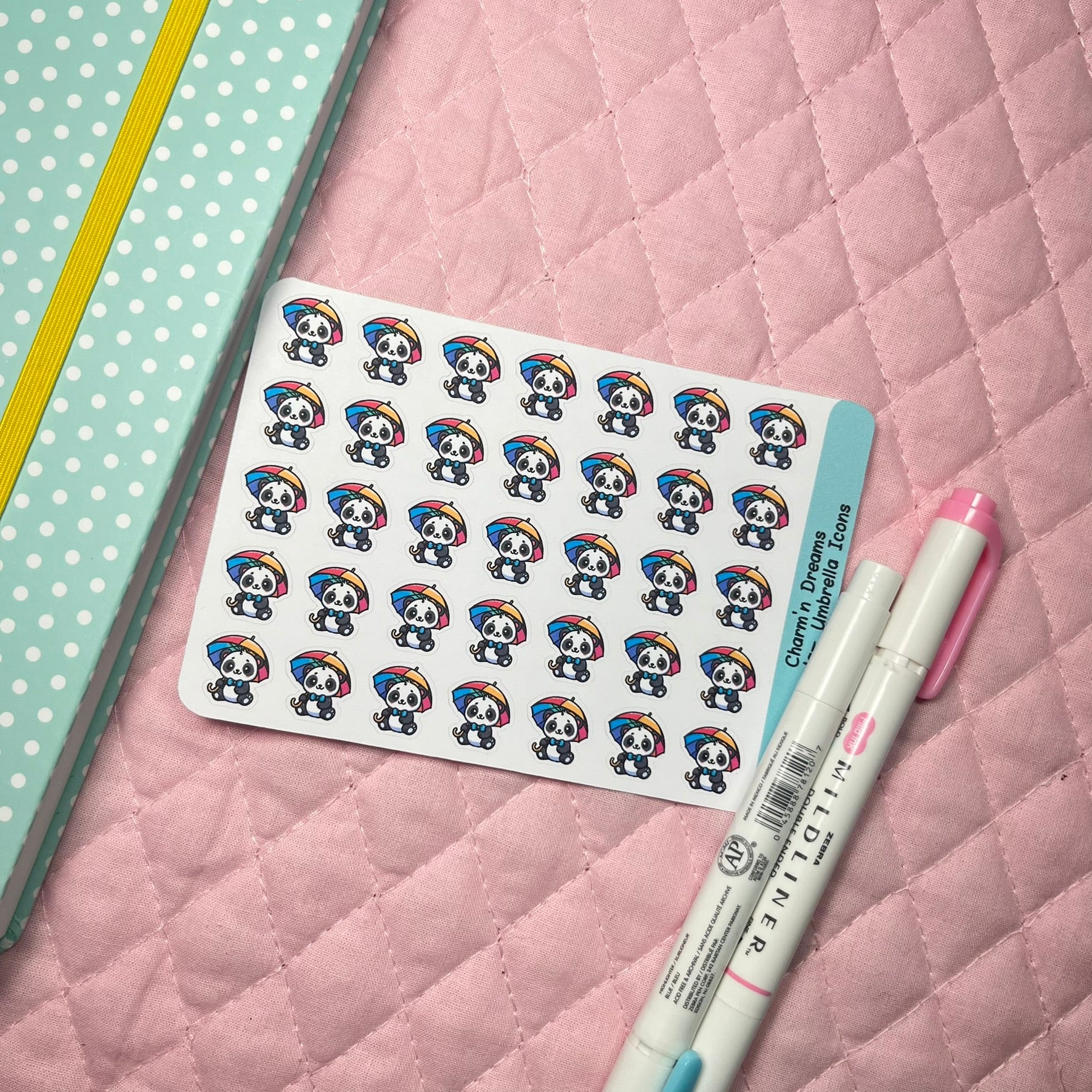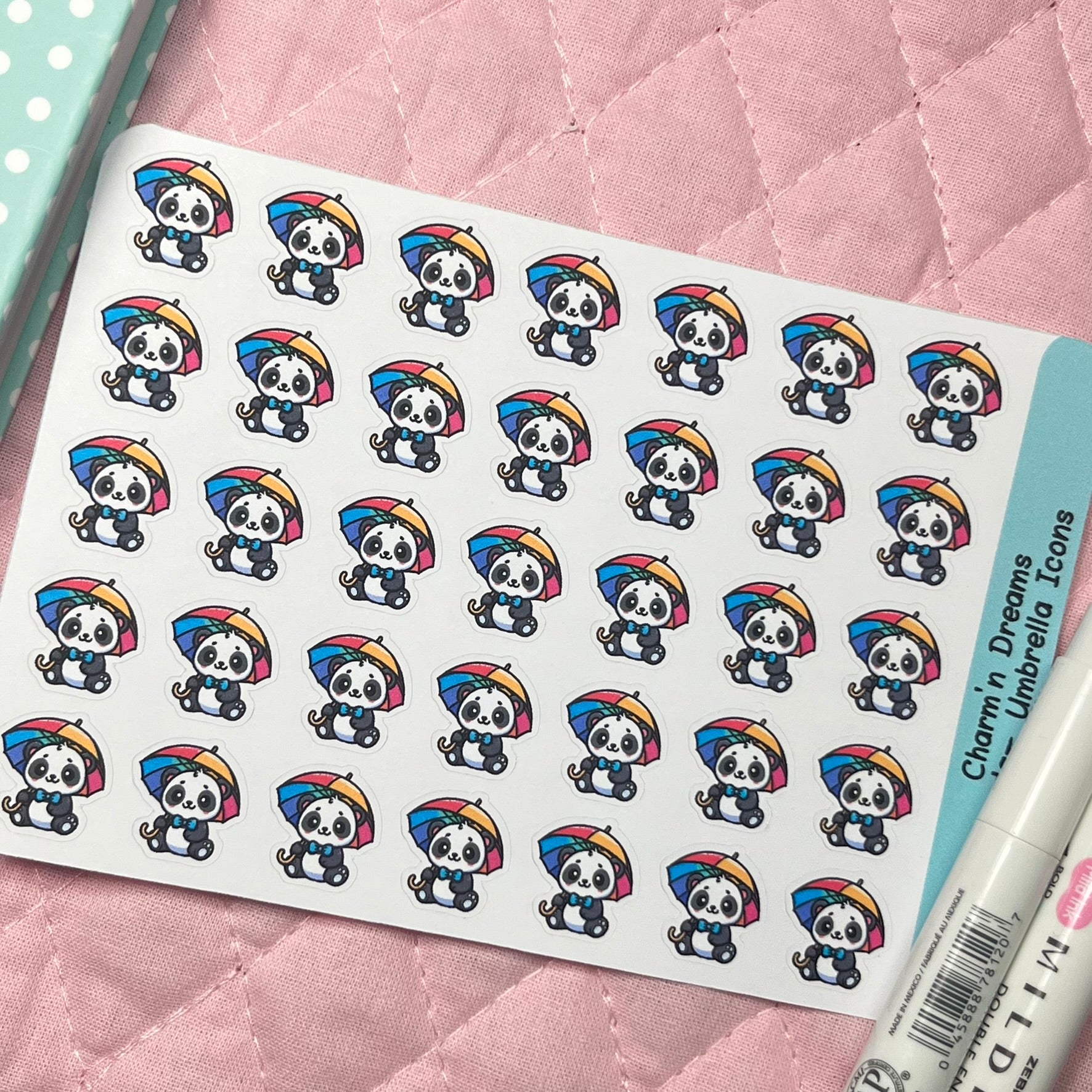 Shower your planner with cuteness using our Panda Umbrella Icon Planner Stickers! These adorable pandas with their tiny umbrellas are perfect for marking rainy day plans, self-care moments, or any task that needs a sprinkle of fun. Use them to brighten up your daily to-do lists, highlight important reminders, or simply add a playful pop to your planning pages. Every day feels sunnier with these charming panda pals!