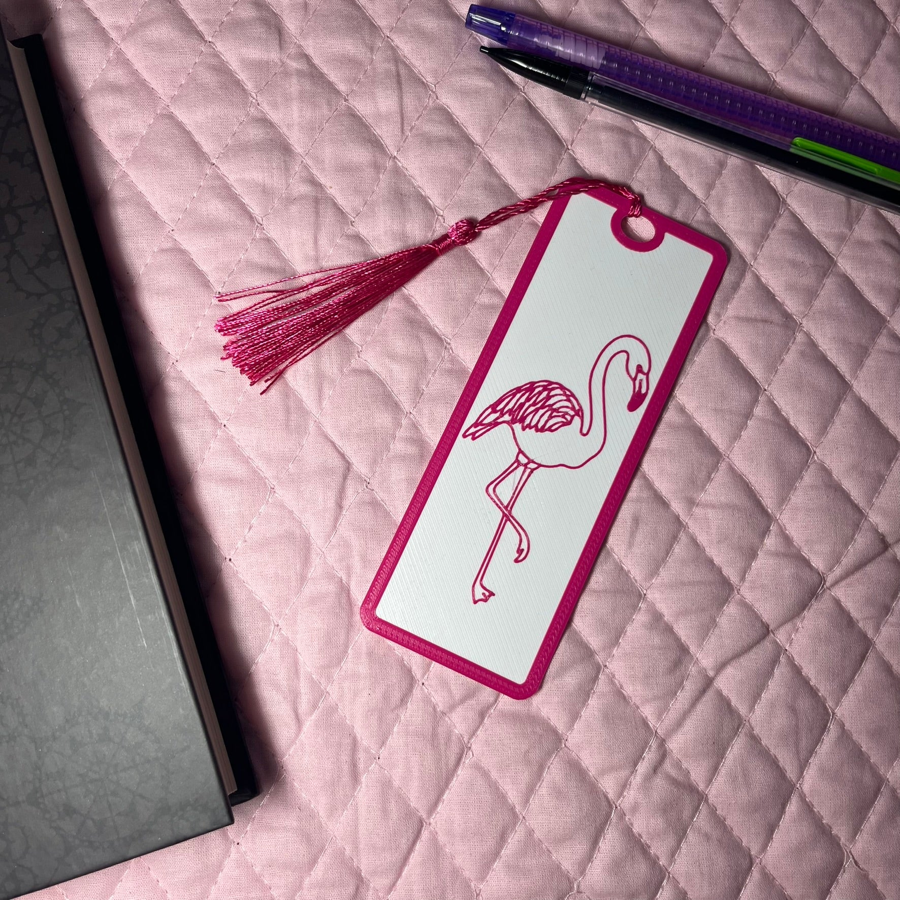 A Pink Flamingo Bookmark 3d printed (PETG) Bookmark! The 3d printed file is created and printed in house for a fun and meaningful product.