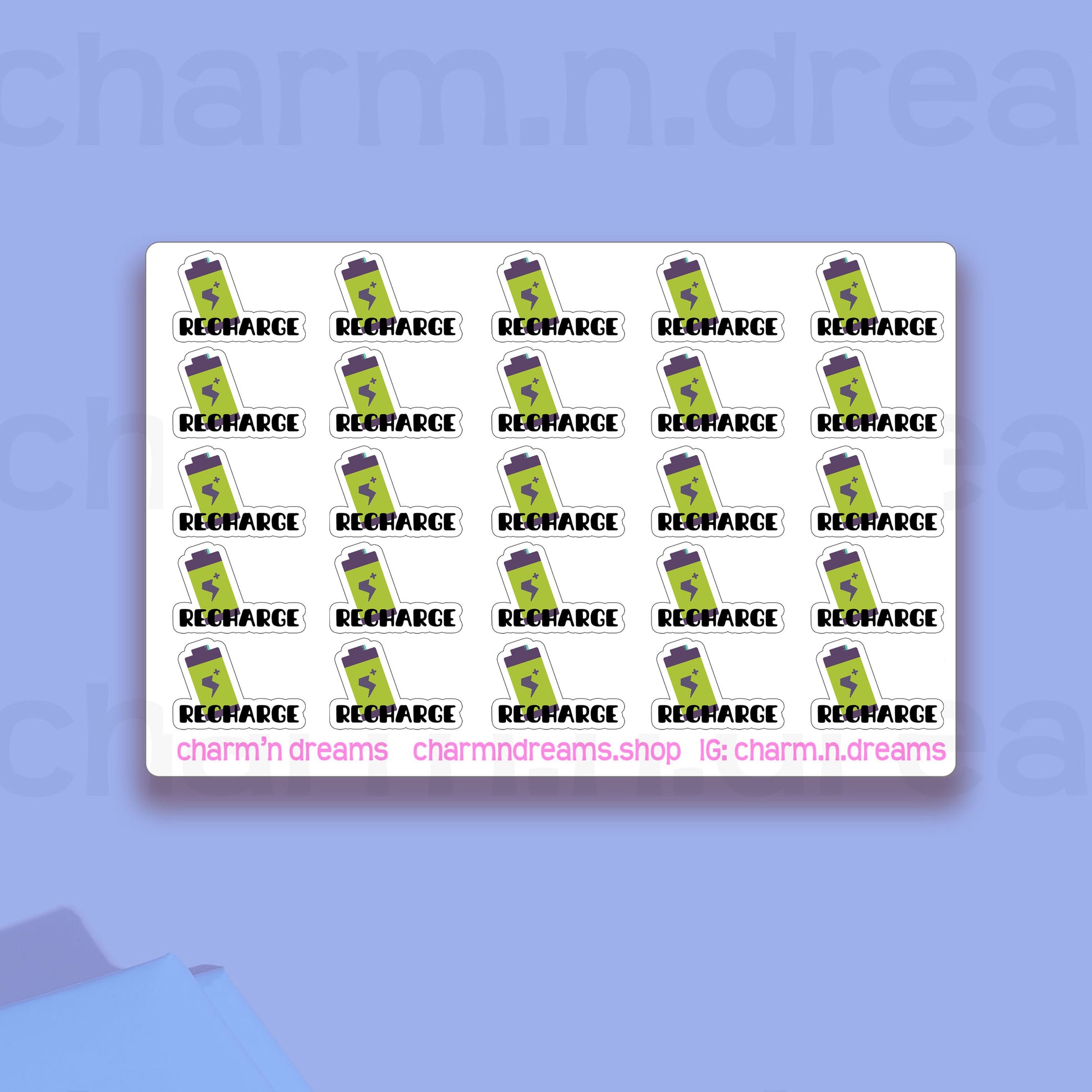 Efficiently remeber to recharge with these planner stickers! Each sheet contains 25 permanent matte stickers, perfect for your monthly, weekly, daily planner, calendar, or bullet journal. At .5 inches high, they are the perfect size for any planner. Order a sheet and simplify your cleaning schedule!