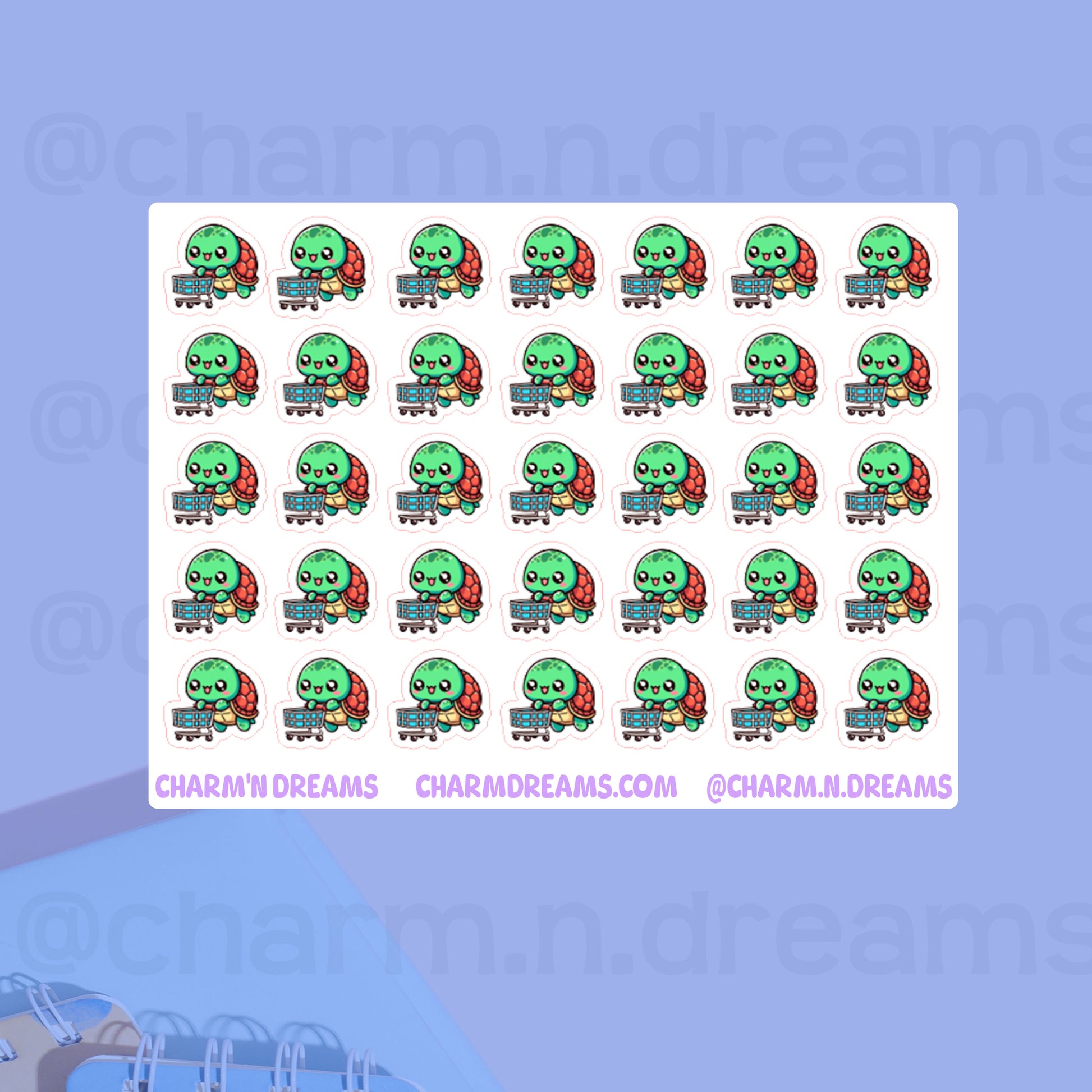 Introducing Turtley Shopping Cart stickers, the perfect addition to your planner for marking daily tasks or journaling as a memory keeper. These cute stickers feature an adulting turtle on permanent matte paper, each measuring about 0.5 inches high. Get 35 stickers per sheet and add a touch of whimsy to your daily routine!